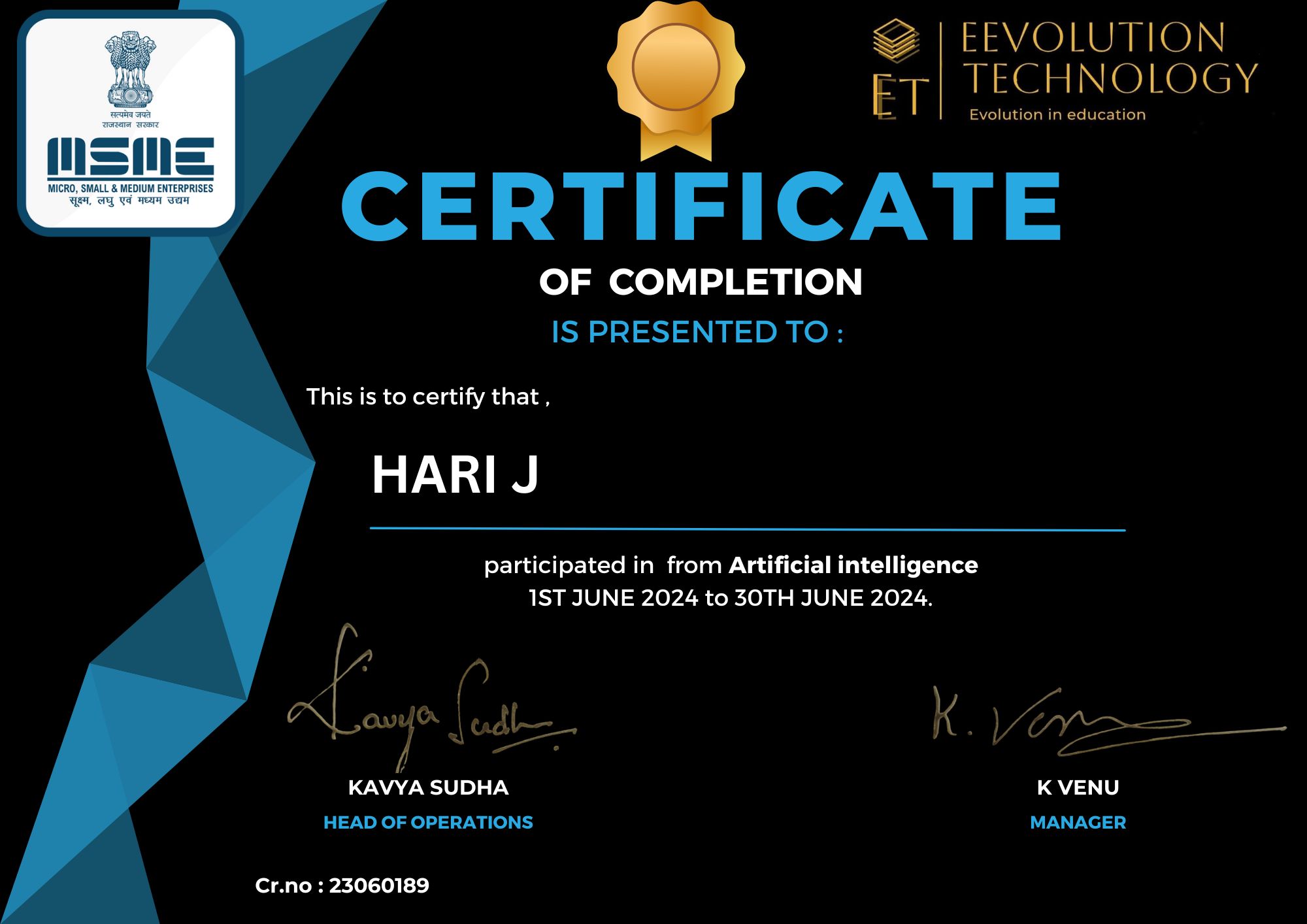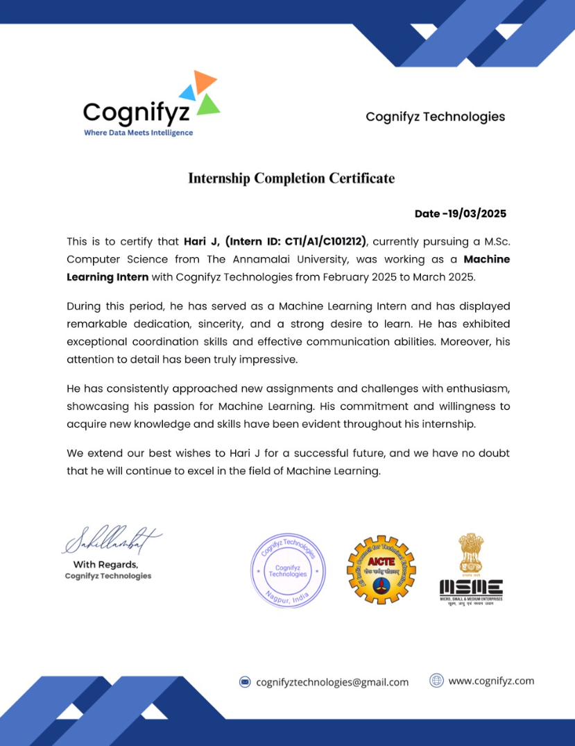 Completed internship in Artificial Intelligence and Machine Learning, working on real-world datasets and model training.